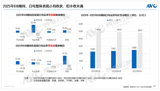 從渠道的角度來(lái)看,2025年618期間(W20-W25)白電品類(lèi)細(xì)分渠道零售額、零售量均實(shí)現(xiàn)雙增長(zhǎng),但均價(jià)未顯著提升,行業(yè)仍需在“量增”基礎(chǔ)上突破 “價(jià)穩(wěn)” 瓶頸。根據(jù)奧維云網(wǎng)統(tǒng)計(jì)數(shù)據(jù)顯示,2025年618期間,平臺(tái)電商、專(zhuān)業(yè)電商、大連鎖&TOP、其他渠道的零售增速分別達(dá)13.5%、52.4%、9.9%、16.4%。