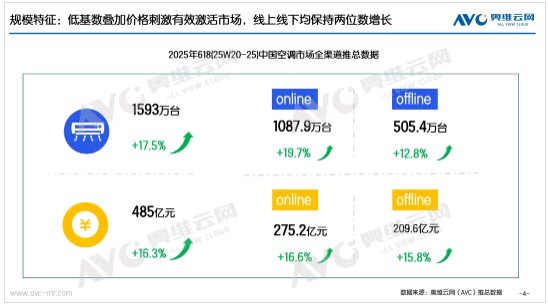 從行業(yè)規(guī)模來(lái)看,根據(jù)奧維云網(wǎng)推總數(shù)據(jù)顯示,2025 年 618 期間,空調(diào)品類(lèi)線(xiàn)上渠道零售額規(guī)模達(dá)275.2 億元,同比增長(zhǎng)16.6% ;線(xiàn)下渠道零售規(guī)模達(dá)209.6 億元,同比增長(zhǎng)15.8% ;全渠道實(shí)現(xiàn)零售額規(guī)模達(dá)485億元,同比增長(zhǎng)16.3% 。