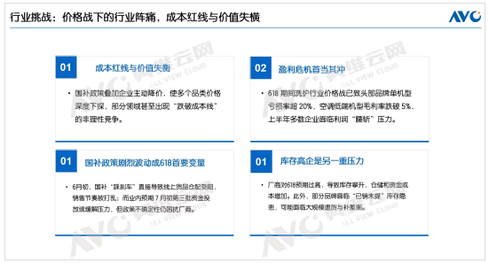 價(jià)格戰(zhàn)下的行業(yè)陣痛:成本紅線(xiàn)與價(jià)值失衡。國(guó)補(bǔ)政策疊加企業(yè)主動(dòng)降價(jià),使多個(gè)品類(lèi)價(jià)格深度下探,部分領(lǐng)域甚至出現(xiàn)“跌破成本線(xiàn)”的非理性競(jìng)爭(zhēng)。這種透支未來(lái)消費(fèi)潛力的競(jìng)爭(zhēng)模式,也為企業(yè)盈利埋下隱憂(yōu)。618 期間,價(jià)格戰(zhàn)持續(xù)沖擊,行業(yè)利潤(rùn)空間被顯著壓縮,預(yù)計(jì)上半年多數(shù)企業(yè)均面臨利潤(rùn)“腰斬”壓力。更嚴(yán)峻的是,大部分商家因?qū)Υ舜?18 備貨預(yù)期過(guò)高,倉(cāng)儲(chǔ)與資金成本激增,嚴(yán)重制約后續(xù)利潤(rùn)空間。