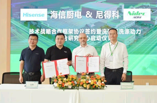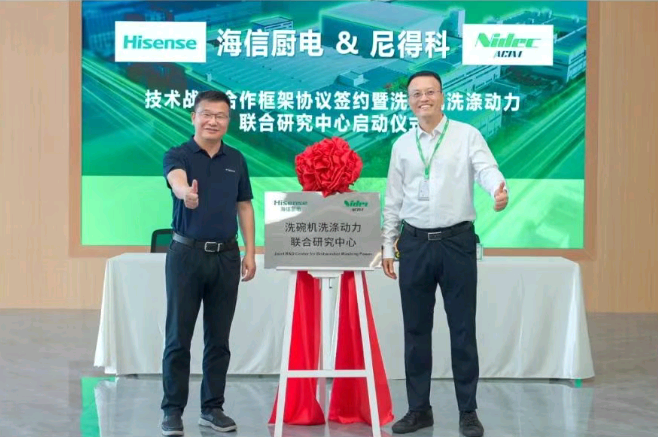 2025年7月22日,海信廚電與全球核心洗滌泵供應商尼得科(Nidec)正式簽署合作協(xié)議,共同成立“洗碗機洗滌動力聯(lián)合研究中心”。該中心旨在深化雙方在洗碗機核心洗滌與加熱泵技術(shù)領域的研發(fā)合作,推動產(chǎn)品性能升級與技術(shù)創(chuàng)新。海信廚電事業(yè)部總裁邵仁展與尼得科電機(青島)有限公司總經(jīng)理崔恒懂出席揭牌儀式。