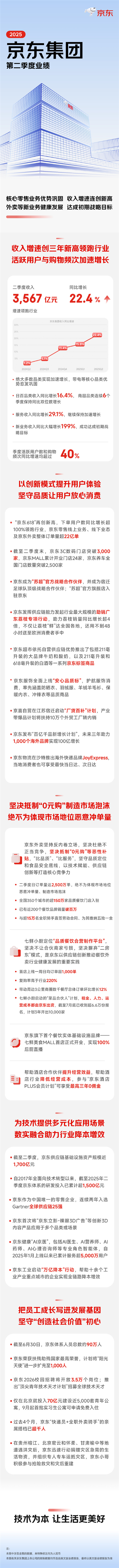 京東集團(tuán)二季度收入能夠繼續(xù)保持加速增長,首先來自于核心零售業(yè)務(wù)上繼續(xù)保持加速增長。這其中,絕大多數(shù)品類實(shí)現(xiàn)加速增長,帶電等核心品類優(yōu)勢愈發(fā)鞏固,日百品類收入同比加速增長了16.4%,其中商超品類連續(xù)6個季度保持收入同比雙位數(shù)增長。而備受外界關(guān)注的包括京東外賣在內(nèi)的新業(yè)務(wù),收入同比大幅增長了199%。