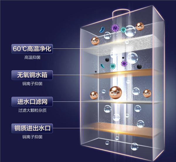 首先是高純度無氧銅水箱,不僅耐腐蝕、抗高溫、換熱效率高,更能通過銅離子的天然抑菌作用,有效抑制大腸桿菌、金黃色葡萄球菌等細菌滋生。搭配60℃高溫凈化抑菌功能,水流經(jīng)過高溫殺菌后,水質(zhì)更潔凈,寶寶嬌嫩的肌膚再也不用擔心細菌刺激。