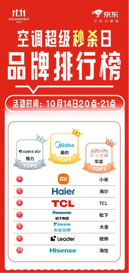 2025年雙十一大促期間,美的空調(diào)在各大電商平臺表現(xiàn)亮眼,實現(xiàn)多平臺“百花齊放”。據(jù)最新戰(zhàn)報顯示,京東專賣店“開門紅美的空調(diào)”首銷12小時實現(xiàn)銷售額突破億元,其中無風(fēng)感空調(diào)銷量超10000臺,在規(guī)模、份額、結(jié)構(gòu)三個維度均位居第一。在10月14日京東空調(diào)超級秒殺日中,美的同樣位列銷售排行榜首位。