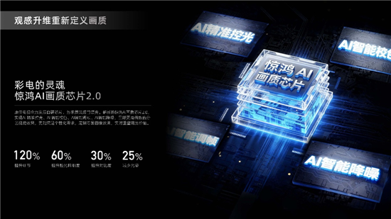 一是驚鴻AI畫質(zhì)芯片2.0,堪稱畫質(zhì)優(yōu)化的“智慧大腦”。作為畫質(zhì)提升的核心引擎,驚鴻AI畫質(zhì)芯片2.0具備四大核心能力:AI精準控光、AI智能校色、AI智能調(diào)幀、AI智能降噪。它不僅能呈現(xiàn)更高倍數(shù)的分區(qū)視覺效果,還可根據(jù)用戶偏好定制專屬圖像,實時優(yōu)化觀賞體驗。比如老人偏愛更柔和的亮度、孩子觀看時自動開啟護眼色彩模式、年輕人追綜藝時強化色彩飽和度,真正實現(xiàn)“千人千面”的專屬畫質(zhì)。經(jīng)實測,該芯片可實現(xiàn)細節(jié)提升120%、控光精細度提升60%、對比度提升30%、光暈減少25%,讓畫質(zhì)優(yōu)勢量化可見。
