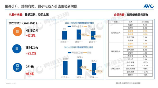 奧維云網(wǎng)(AVC)監(jiān)測數(shù)據(jù)顯示,2025雙十一(W41-46,10月6日至11月16日)廚小家電(包含品類:電飯煲、電磁爐、電燉鍋、電水壺、電蒸鍋、電壓力鍋、豆?jié){機、破壁機、攪拌機、榨汁機、煎烤機、養(yǎng)生壺、空氣炸鍋、臺式微蒸烤)在線上全渠道零售額同比下降17.3%,零售量同比下降22.2%,反映出消費需求朝著更理性的方向發(fā)展。與此同時,行業(yè)整體均價上漲6.4%,顯示消費結(jié)構(gòu)正在向更高價位產(chǎn)品傾斜。從品類價格來看,多個主銷品類均價明顯上揚。電水壺、電飯煲、電燉鍋等日常烹飪類廚小電均價分別上漲16.3%、12.5%、8.0%,煎烤機、豆?jié){機、養(yǎng)生壺、榨汁機等輔助料理類,廚小電均價分別上漲17.5%、11.2%、8.7%和7.4%。當前市場正處于政策刺激后的理性回調(diào)階段,隨著消費節(jié)奏回歸常態(tài),疊加居民消費信心逐步修復,市場有望在后續(xù)周期中實現(xiàn)更可持續(xù)的增長。