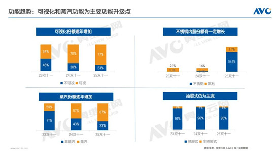 可視化與蒸汽功能正驅(qū)動空氣炸鍋品類的全面升級。奧維云網(wǎng)(AVC)監(jiān)測數(shù)據(jù)顯示,可視化機型份額從2023年雙十一的54%快速提升至2025年雙十一的77%,增長23%,可視化空氣炸鍋借鑒烤箱監(jiān)控優(yōu)勢,實時掌握食材狀態(tài),防烤糊更安全。與此同時,蒸汽功能呈現(xiàn)更為顯著的爆發(fā)態(tài)勢,其份額從29%躍升至67%,已取代傳統(tǒng)型號成為市場主流。這一趨勢背后是雙重需求的滿足:在烹飪效果上,蒸汽嫩炸技術(shù)有效改善食物口感,避免干柴;在功能集成上,則通過融合蒸、烤、炸、烘焙等多種模式,以“一機多用”契合了廚房空間集約化和使用便捷化的消費趨勢。兩大功能升級路徑共同表明,空氣炸鍋已從單一的替代油炸工具,逐步演進為注重體驗、健康與效率的現(xiàn)代廚房中心設(shè)備。