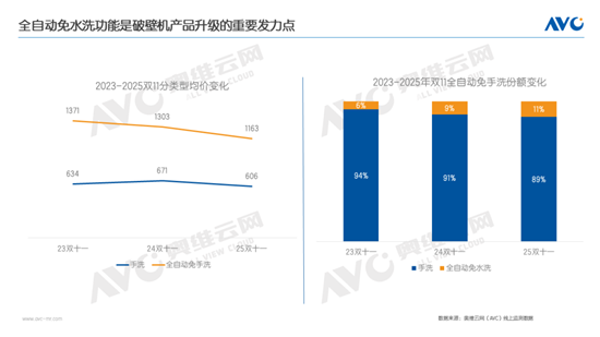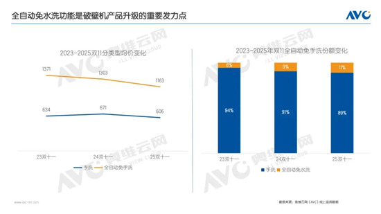 全自動免手洗破壁機份額提升、價格更親民,加速高品質(zhì)廚房體驗普及。奧維云網(wǎng)(AVC)線上監(jiān)測數(shù)據(jù)顯示,2025年雙十一期間,全自動免手洗破壁機零售額份額達到11%,份額提升2%。該品類憑借其“免手洗”的核心功能,精準解決了傳統(tǒng)破壁機存在的清洗困難、渣滓殘留和細菌滋生等痛點,不僅滿足了消費者追求便捷的需求,也降低了因手動清洗導致割傷等安全隱患,因此成為市場產(chǎn)品升級的重要方向之一。