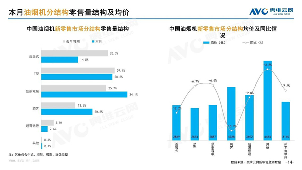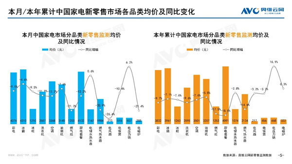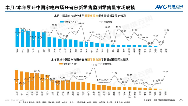 本月主要品類中,同比上升的有:電風(fēng)扇、電磁爐、電壓力鍋、電飯煲、燃?xì)鉄崴、燃(xì)庠睢⒂蜔煓C(jī)、洗衣機(jī)、冰箱、空調(diào)、彩電,同比分別上升353.4%、203.7%、38.8%、31.4%、28.4%、20.2%、16%、13.7%、8.8%、4%、2.4%;同比下降的品類有:廚電套餐、冰柜、電儲水熱水器,同比分別下降-0.5%、-6.5%、-19.7%;