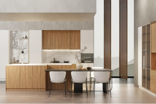 在色彩與材質(zhì)的搭配上,“子矜”秉持“傳統(tǒng)與現(xiàn)實(shí)交織”的設(shè)計(jì)理念,將木紋與純色融合。色高光平板門(mén)的簡(jiǎn)潔明快,與暖色木紋造型門(mén)板的溫潤(rùn)厚重相得益彰,兩既延續(xù)中式空間內(nèi)斂沉穩(wěn)的特質(zhì),又通過(guò)現(xiàn)代工藝提升視覺(jué)純凈度,精準(zhǔn)詮釋了新中式風(fēng)格的雅致與清新。