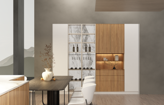 意式煙熏蝕刻工藝與雪花紋原色,在門(mén)板上交織出深邃而富有質(zhì)感的肌理,線條簡(jiǎn)潔流暢,淋漓盡致展現(xiàn)出意式極簡(jiǎn)的高雅風(fēng)范。 廚房作為核心功能區(qū)域,“意宴東方”搭載了“御廚8號(hào)”超級(jí)烹飪配置,憑借“大格局、多功能”的顯著優(yōu)勢(shì),精準(zhǔn)契合宴請(qǐng)的多樣化需求。1216mm超寬烤箱搭配8眼灶、超寬煙機(jī),以及嵌入式雙蒸烤箱,共同構(gòu)成了一套功能齊全的中西廚超級(jí)烹飪系統(tǒng)。超寬的烹飪區(qū)域與豐富多樣的烹飪?cè)O(shè)備,能夠充分滿足多人同時(shí)操作的需求,確保出餐過(guò)程有條不紊,充分彰顯主人的待客實(shí)力與生活格調(diào)。