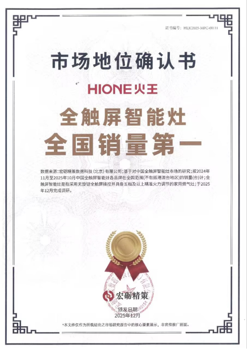 2025年12月22日,經(jīng)權(quán)威第三方專業(yè)機構(gòu)對全觸屏智能灶行業(yè)調(diào)研,火王榮獲“全觸屏智能灶全國銷量第一”市場地位認證。這份基于中國大陸地區(qū)(不含港澳臺)的全面調(diào)研數(shù)據(jù),不僅印證了火王在智能廚電細分領(lǐng)域的領(lǐng)軍地位,更是對其數(shù)十年堅持技術(shù)創(chuàng)新、深耕用戶體驗戰(zhàn)略的權(quán)威認可。