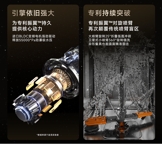 比如,在《馬上春晚》上演示的追覓洗碗機(jī),為何能夠打消高端用戶清潔覆蓋死角顧慮?正是得益于追覓廚電自研的“振翼噴淋臂”。相比于傳統(tǒng)固定翼噴淋臂,追覓采用仿生柔性結(jié)構(gòu)和鎳鈦合金材料,實(shí)現(xiàn)了噴淋臂的3D折疊,同時(shí)疊加污漬傳感器以及核心人工智能算法,可以針對(duì)不同區(qū)域的臟污程度,自動(dòng)改變兩邊折疊的角度,從而達(dá)到全腔百分百覆蓋,即便碗盤隨意擺放,亦可實(shí)現(xiàn)全域無(wú)死角的深度潔凈。