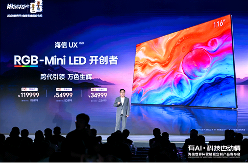 海信 UX2026 款推出 85、100 以及全球最大的116英寸 RGB-Mini LED 電視三大黃金規(guī)格,零售價(jià)分別為 34999元、54999元、119999元。