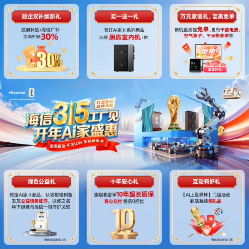 為切實(shí)惠及廣大消費(fèi)者,海信中央空調(diào)315工廠見活動(dòng),還帶來多重惠購福利驚喜,全國聯(lián)動(dòng),千店讓利。凡消費(fèi)者參與購機(jī)活動(dòng),可享政企雙補(bǔ)貼,至高補(bǔ)貼30%;預(yù)訂海信Ai家系列新品,加贈(zèng)廚房專用室內(nèi)機(jī)1臺(tái);選購Ai家II系列新品,參與綠色公益,認(rèn)領(lǐng)梭梭樹苗發(fā)放公益植物證書,共同攜手種下綠意與海信一同守護(hù)戈壁。