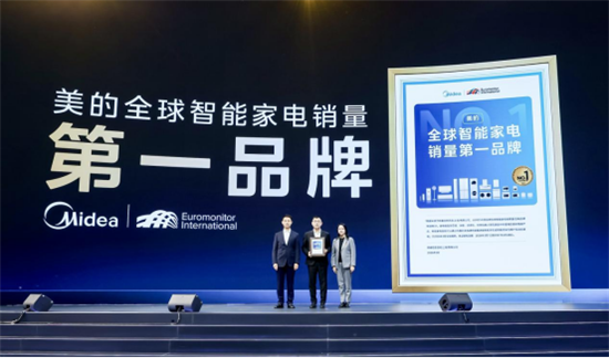 歐睿中國區(qū)總經(jīng)理穆愔為美的頒發(fā)2025年全球智能家電銷量第一證書,中國家電研究院副院長曲宗峰現(xiàn)場見證。