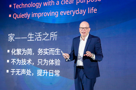 作為連續(xù)多年深度參與AWE的全球家電行業(yè)領(lǐng)導(dǎo)者之一,博西家用電器集團(tuán)董事會(huì)主席兼首席執(zhí)行官邁致遠(yuǎn)博士受邀出席本屆高峰論壇,并發(fā)表題為《讓智能融入家》的主題演講。他從一個(gè)普通家庭的晚餐場(chǎng)景切入,深刻闡釋了博西家電對(duì)智能的終極理解:最好的技術(shù)是讓人“用而不覺”,為消費(fèi)者創(chuàng)造那些微小而重要的幸福時(shí)刻,提升“消費(fèi)者幸福感”。
