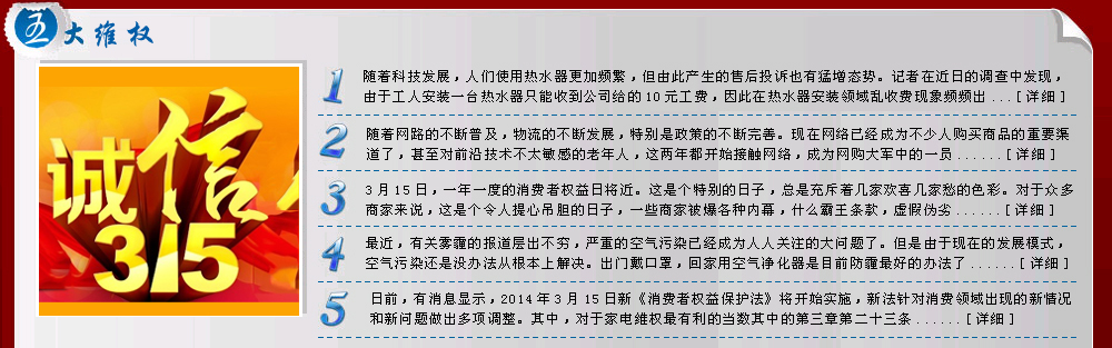 江蘇省家電維修協(xié)會(huì)今天下午發(fā)布了2013年全年的投訴狀況,去年共接到涉及家電三包期方面的投訴4120起,其中進(jìn)口......[詳細(xì)]